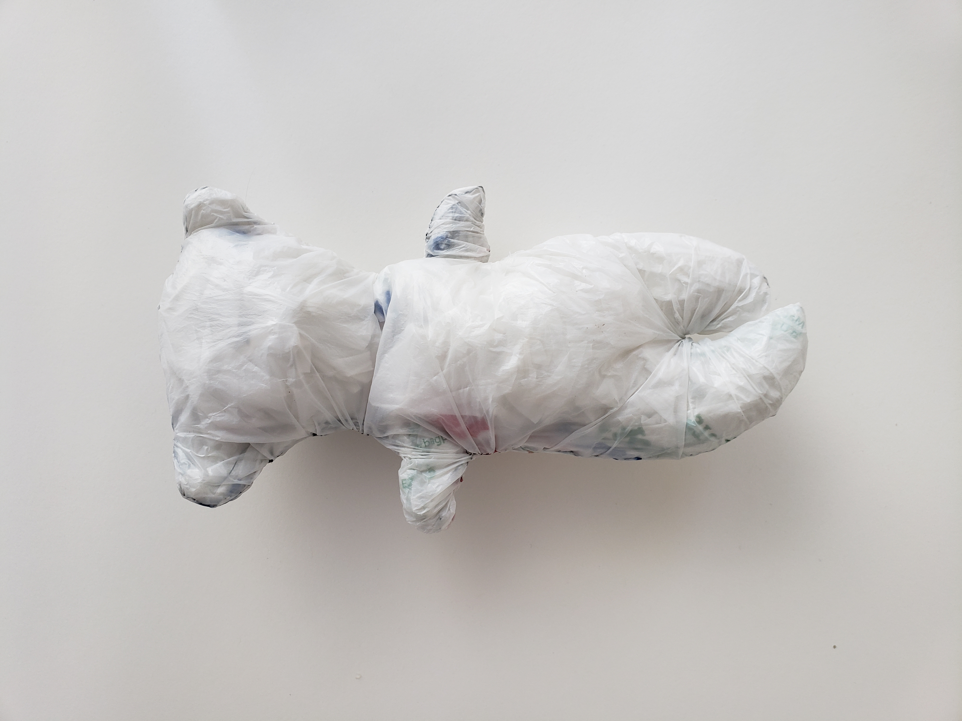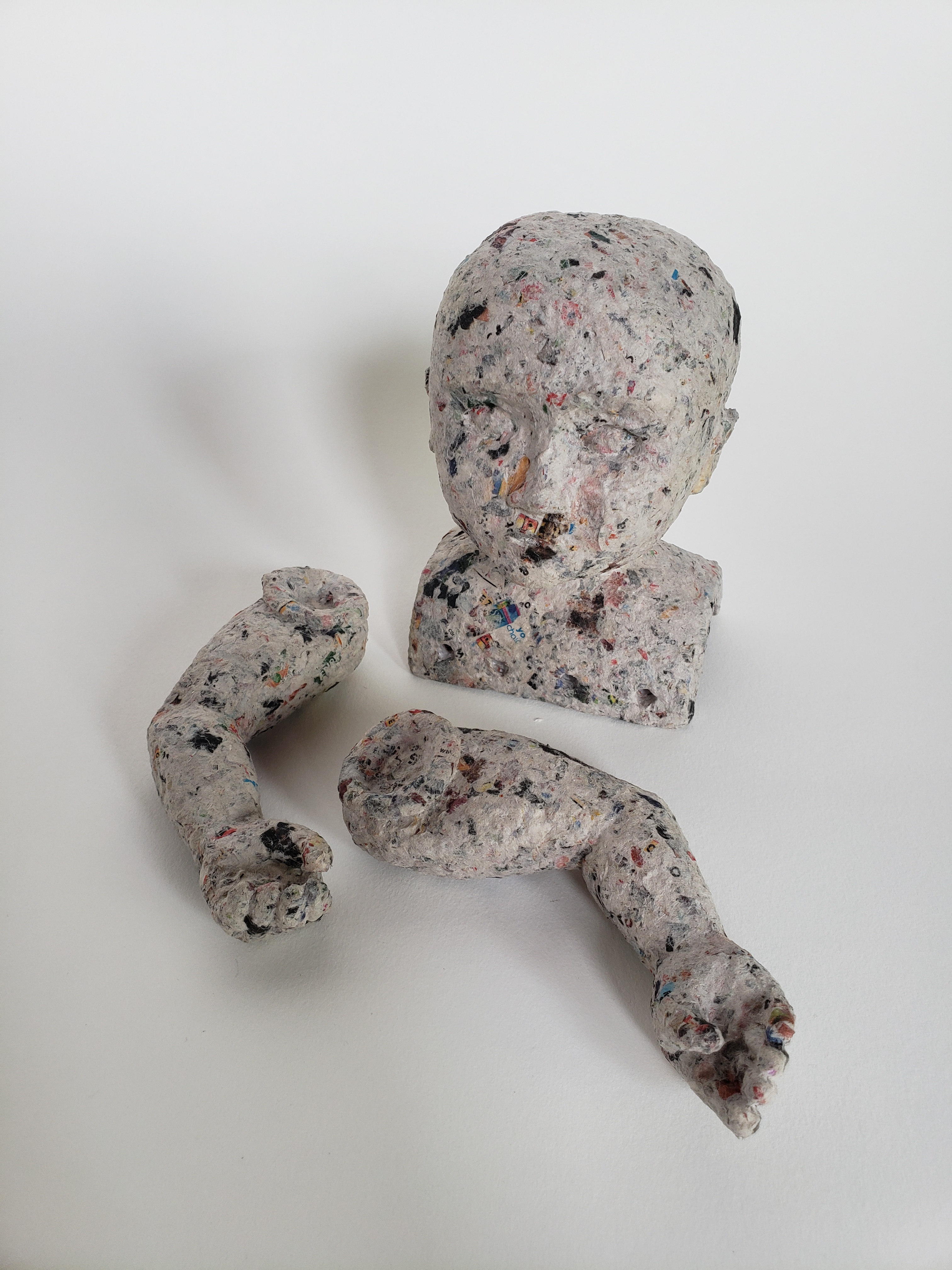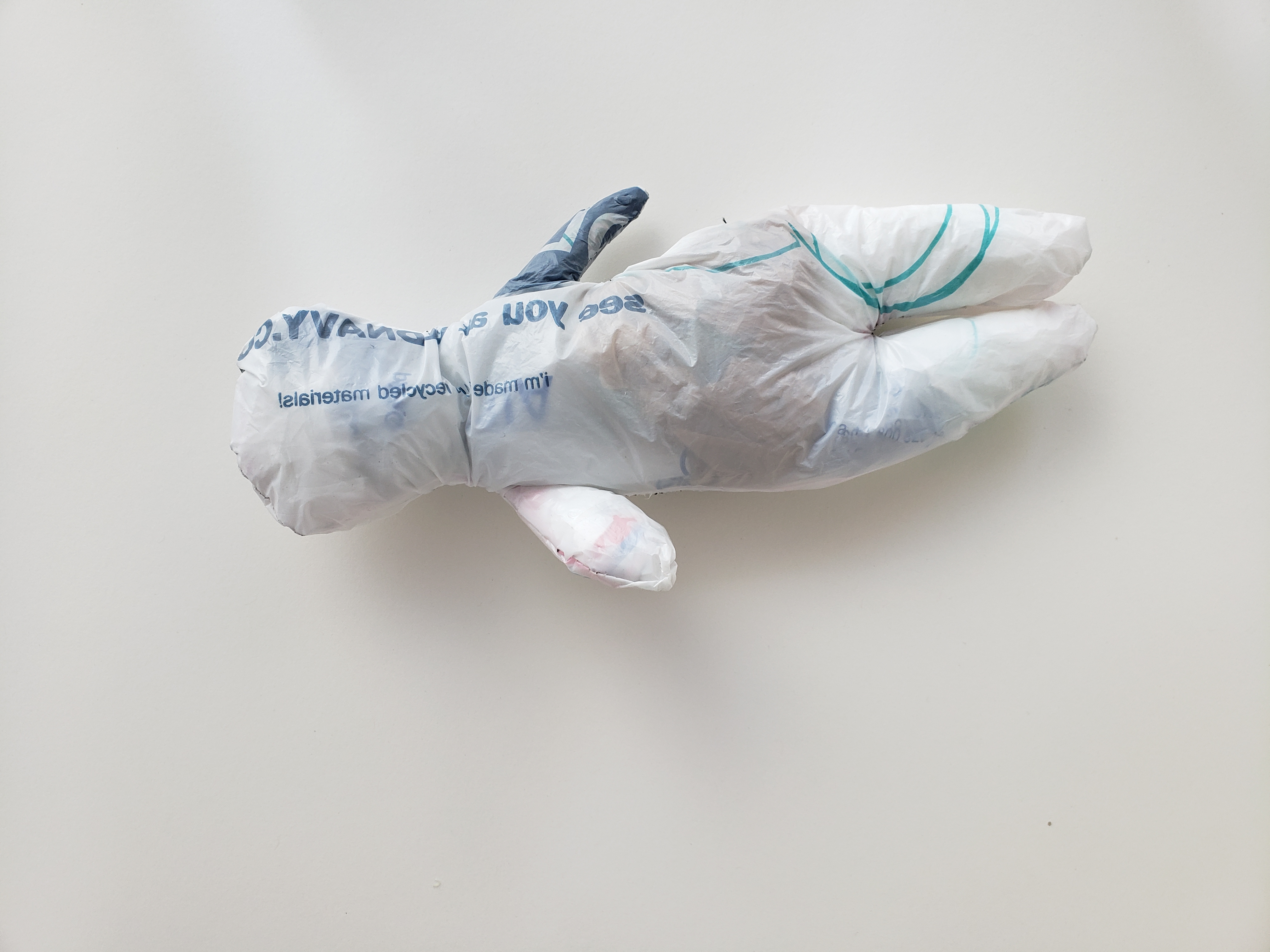 Dolls and doll parts made from single use packaging. Plastic bags, circulars, polystyrene.